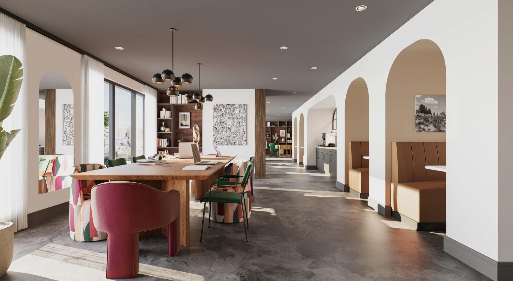 a modern looking lounge room with large windows and seating a work room with a table chairs and booths a lounge room with a couch and a table and chairs a swimming pool in a courtyard in front of a building a building with many windows and a pool a building at night with cars parked in front